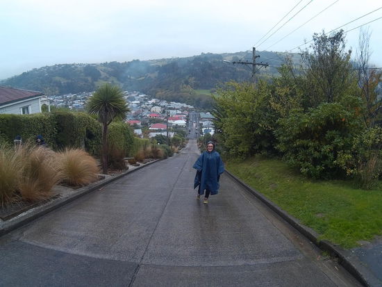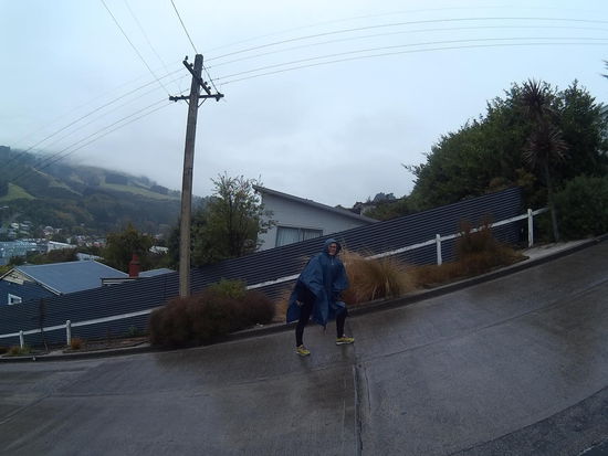 Wir halten für einen Fotostop an der steilsten Straße der Welt. Da es mittlerweile ordentlich regnet, kommt das Bali Regencape wieder zum Einsatz. Die Straße ist echt steil, nur kommt das auf Fotos leider nicht so rüber. Hier bewährt sich mal wieder der Fischaugeneffekt meiner Cam, ich kann es noch besser einfangen, als Janikas Cam. Ich lege mich auch auf die Straße für ein Foto, das Janika netterweise macht, dabei stelle ich einen anderen interessanten Effekt fest: der starke Regen läuft die Straße runter und direkt in mein Regencape.