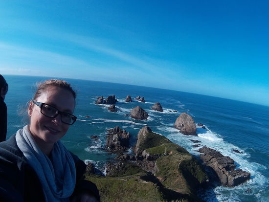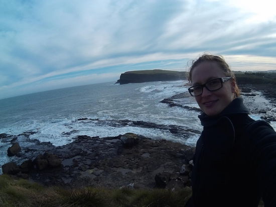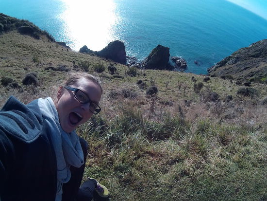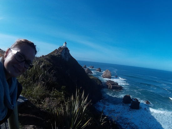 Das Wetter ist schon viel besser, die Sonne scheint. Als wir am Parkplatz des Lighthouse walk stoppen, nehme ich meine Mütze gar nicht erst mit, wohl aber die dicke Jacke. Zusammen machen wir uns auf den Weg zum Leuchtturm, der etwa 10 Minuten dauert. Jedesmal wenn ich ein Selfie mache, singt einer aus der Vierergruppe Jungs, Selfiiiiie. Aber es ist nicht böse gemeint. Ich habe ca. 1 Mio. Selfies aus fast 10 Ländern, sage ich, ich liebe Selfies.