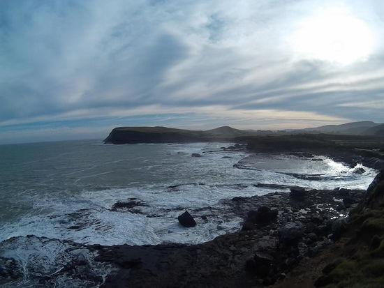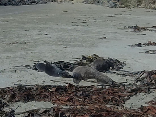 Weit unten am Strand sehen wir ein paar seals, also Seehunde, sie sind schwer auszumachen. Die zwei Jungen sehe ich als erstes, weil sie grau sind und sich bewegen. Die Mama liegt in der Nähe und imitiert einen Fels.
