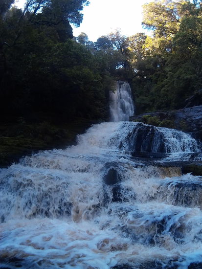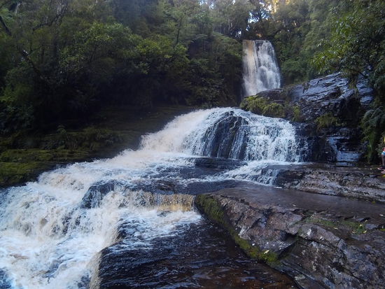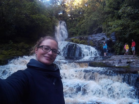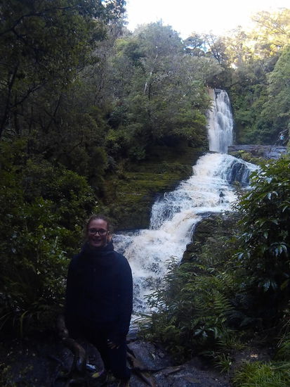 Nachdem alle ein Foto haben geht's weiter zum McLean Waterfall. 40 Minuten dauert der Walk durch den Wald zum Wasserfall hin und zurück. Das ist es aber auch wert, der Wasserfall ist tatsächlich sehr schön. In mehreren Kaskaden ergießt sich der Fluss die Felswand runter und fließt dann direkt weiter. Rast in einem Aufangbecken gibt es für das Wasser nicht. Aber ich muss lange warten, bis ich ein paar Fotos ohne andere Menschen hinbekomme.
