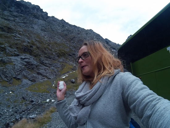 Als erstes suchen sich die meisten eine Handvoll Schnee zum fotografieren. Ich auch. Nur was macht man danach damit? Da einer der Jungs aus der Football Vierergruppe schon mindestens drei Leute, die aus dem Bus steigen, mit Schnee beworfen hat, bekommt er meine Ladung ab. Volltreffer. Ich nehme mal lieber die Beine in die Hand. Vom Parkplatz gegenüber kann man eine tolle Aussicht knipsen. Aber wieso stehen denn so viele von uns um das geparkte Auto herum? Ach, da sitzt ein Kea auf dem Spiegel und versucht das Gummi am Fenster zu lösen. Sieht aus wie ein Papagei.