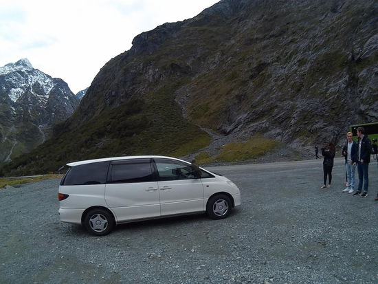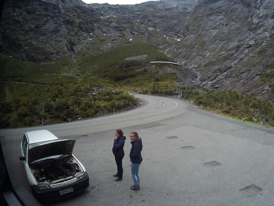 Auf der anderen Seite warten einige Autos, die ebenfalls von Keas belagert werden. Der Busfahrer hält am nächsten Parkplatz, damit wir ein paar Fotos machen können. Eigentlich will er wieder nur kurz halten, denn wenn wir früh genug dran sind, können wir gleich noch einen Walk machen. Aber auf dem Parkplatz steht schon ein Auto mit offener Motorhaube, das zwei Mädchen gehört. Sie haben offenbar eine Panne. Natürlich bietet er seine Hilfe an. Ich höre, dass er glaubt, es liege am niedrigen Ölstand.