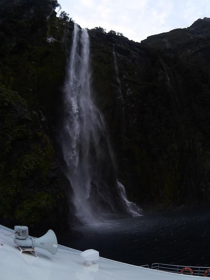 Die Berge ragen schroff auf, teilweise mit Schnee oder Eis gekrönt und immer wieder sehen wir Wasserfälle. Die schmaleren sind vermutlich durch die Regenfälle der letzten Zeit verursacht. Der Größte fließt über eine Klippe, die ihn teilt, woraufhin er sich weiter unten wieder vereint. Wie Liebende sage ich, wie eine Nase, aus der Schnodder fließt, meint Amanda. Als wir das Meer erreichen, werden die Wellen etwas höher. Wir stehen ganz vorne und halten uns mit einer Hand an der Reling fest. Jihaaa. Als wir wieder in ruhigeres Gewässer kommen, bittet der Kapitän uns über Lautsprecher, uns doch bitte festzuhalten, denn er dreht das Boot. Wow, sind wir schon es eine Stunde unterwegs?