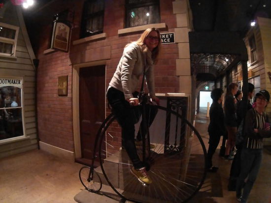 In den nächsten Räumen hat das Museum eine historische Straße Christchurchs nachgebaut. So wie hier gab es sie nie, aber die Fassaden aller Läden sind original nachgebaut. Nur eben. aus verschiedenen Straßen zusammen gefügt. Ich bitte einen der Asiaten, mich auf dem altertümlichen Fahrrad zu fotografieren.