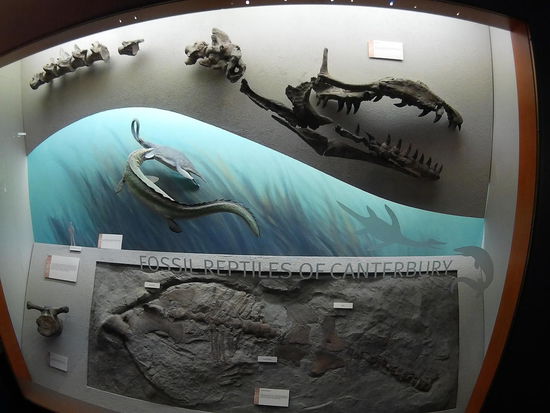Im nächsten Raum steht ein Dinosaurier Skelett und der Guide erklärt uns, wieso Neuseeland keine Dinos hatte. "Zu der Zeit waren wir noch die meiste Zeit unter Wasser." Große Meeresechsen hatten sie natürlich.