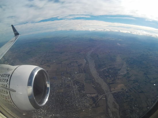 Ich habe Dank Anja von STA auch auf diesem Flug einen Fensterplatz. Neben mir sitzen zwei junge Mädels, die ich auch ab und zu schonmal im Kiwi Bus gesehen habe. Hinter mir sitzt eine kleine Familie, Mutter, Vater, kleiner Junge. Vermutlich Inder. Leider riecht einer von ihnen ziemlich streng, vielleicht hat der Junge eine volle Windel? Der Kleine gerbärdet sich ohnehin ziemlich wild. Tritt permanent gegen die Sitze, lehnt sich auf die Lehne des Sitzes vor ihm und heult und schreit dann für die nächsten Stunden. Scheinbar mag er nicht fliegen.