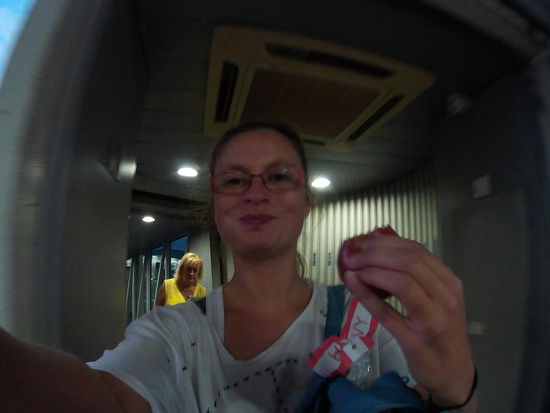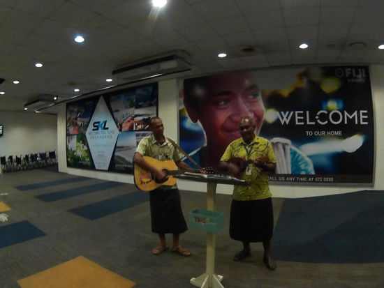 Dort läuft der PC af Fiji Team. Sorry Leute, das wird hier nichts mit dem CheckIn. Wir bekommen ein FruchtsaftGetränk aufs Haus und sollen uns in die Bar setzen. Auf dem Weg höre ich, wie das Mädel vor mir mit dem Mitarbieter spricht "Have you found me shoes? I lost them here 4 years ago?" ist was ich verstehe. Da muss ich nachfragen und erfahre, dass ich mich verhört habe, 4 days ago hat sie ihre Schuhe verloren.