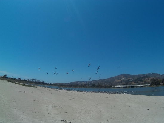 Am Ufer des Sees, in den sich der Fluß, über den die Brücke führt ergießt, ohne jedoch momentan im Meer zu münden (vielleicht gezeitenabhängig), sitzen unzählige Vögel. Mehr zu uns an der Seite eine große Gruppe kleiner weißer Vögel, aber am gesamten meerseitigen Ufer entlang sitzen hunderte großer schwarzer Vögel.