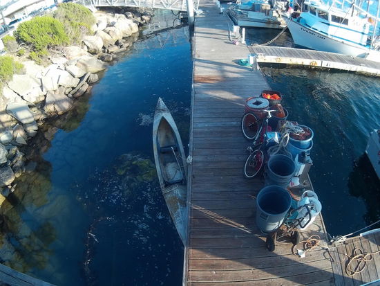 Links auf einer kleinen Insel im Meer liegen Seelöwen und bellen in ihrer Seelöwensprache miteinander. Wir stehen auf dem Steg und plötzlich schwimmt ziemlich vor uns eine Seelöwenmama mit ihrem Kleinen. Sie bringt ihm das schwimmen bei, meint eine Frau neben uns.