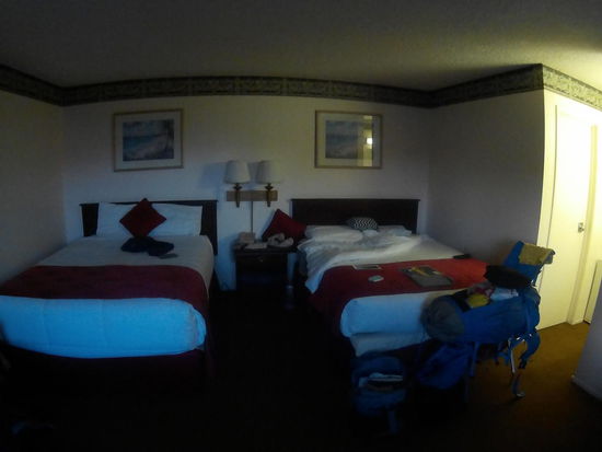 Wir kommen an, parken das Auto und checken ein. Das Zimmer ist ganz nett, mit zwei Queensize Betten.