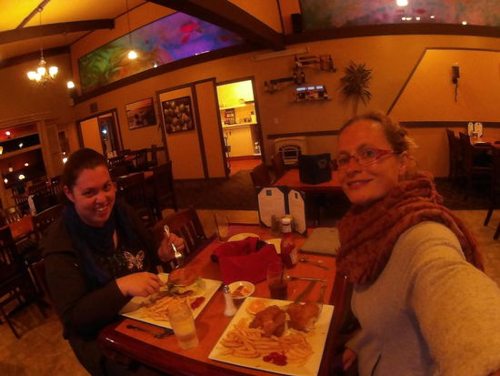 Wir sind müde und hungrig. Im Restaurant nebenan gibt es 10% Rabatt. Eigentlich wollten wir Amerikaner spielen, uns was in einem fast food Restaurant holen und im Bett essen, aber so geht's auch. Ronja nimmt einen Burger, ich fried chicken, da haben wir also unser Fastfood.