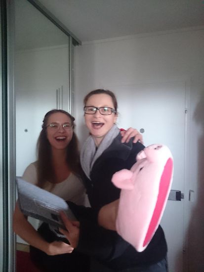 Ich habe die Ruhe weg ( Das Gehirn hatte wohl zeitweise abgeschaltet). Sarah muss zum Aufbruch mahnen... Ein Abschiedsfoto mit Zuzanna, eins reisefertig auf der Schwelle... und ab geht's
