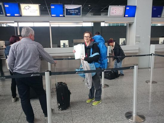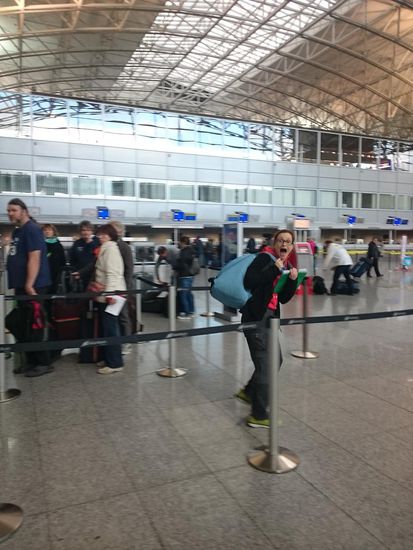 Ankunft im Flughafen. Doch schon so spät, erstmal das Gepäck aufgeben. Gut, dass Sarah zum Aufbruch gedrängt hat...