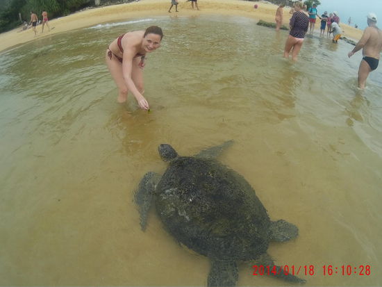 Tanja und ich besuchen nachmittags nochmal die Schildkroeten. Diesmal sind nur drei da und mehr Touristen, aber dennoch ist es nicht ueberlaufen. Wir machen Fotos und Videos mit der ActionCam und diese hat ihren ersten Einsatz unter Wasser. Gar nicht schlecht das Ergebnis.