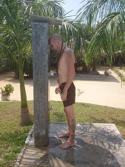 Einer der Surflehrer nutzt Pausen, wenn sein Schüler sich zu ihm zurück kämpft, um mir ein paar Tips zu geben. Kleinigkeiten wie "zu früh aufgestanden", "nimm diese Welle"...und plötzlich klappts. Ich stehe, springe ab, jubele, der Surflehrer auch. Klasse, hätte ich den mal von Anfang an gehabt. (Philipp von der Surfschule Reef End, falls es jemand auch mit dem Surfen in Hikka versuchen will). Ich kann mich gar nicht mehr trennen von den Wellen. Just catch another one, just one more... Und bin erst nach anderthalb Stunden wieder in der Surfschule. Bekommt dort niemand mit. Dafür erlebt die ganze Bar, wie ich Akki von meinem Glück erzähle und ein Tänzchen hinlege.