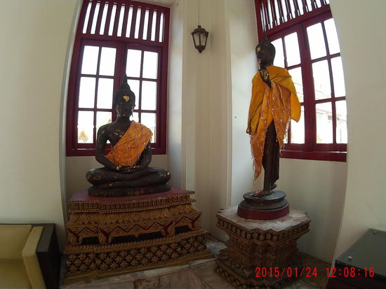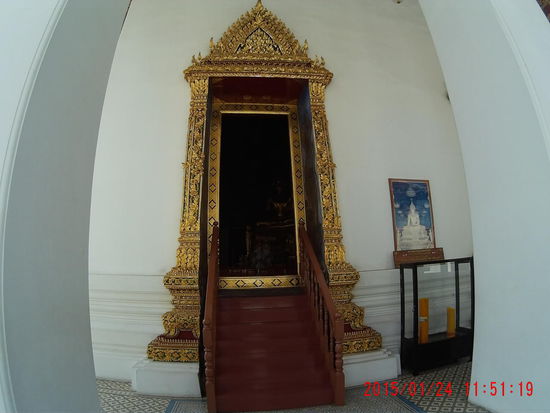 Als nächstes stoße ich auf einen Komplex mit diversen Schnörkelbauten. Ein Tempel? Der Golden Mountain ist es keinesfalls, da muss ich erst einen Fluß überqueren. Das vordere scheint ein kleiner Park mit Pavillon, der aber in der prallen Sonne nicht zum Verweilen einlädt. Ein paar Thais sitzen im Schatten des Pavillons. Einer zeigt auf den Komplex hinter ihm, definitiv ein Tempel und nickt aufmunternd. Nun gut, wenn ich schon hier bin. Ich konsultiere die Karte und beschließe, dass es wohl die Phraya Fortress sein muss. Allerdings ist hier kein Mensch, ich zögere etwas, den Komplex durch eins der Tore zu betreten. Aber ich bin willkommen und werde eifrig in den schönen Schrein gebeten. Auch hier spende ich etwas in die Donation Box, eben weil ich nicht dazu genötigt werde. Dann geht es weiter ins Nachbargebäude, das recht hoch ist. Es scheint der Meditation geweiht, jede Etage hat ein eigenes Thema. Es gibt eine Etage mit Wandelgängen für die schreitende Meditation, eine Ebene ist der sitzenden Meditation geweiht, an den Wänden sind jeweils Tafeln mit Erklärungen und Anleitungen angebracht. Eine Bibliothek mit unzähligen Buddha an der Außenwände des Wandelganges und Leitsätzen auf der Innenseite. Ich steige natürlich erstmal nach ganz oben. Die oberen Etagen werden renoviert und sind christomäßig verhüllt, so dass ich leider nichts von dem sonst sicher spektakulären Blick habe. Einen kleinen Schrein gibt es hier auch. Auf dem Weg hinab verweile ich in der meditativen Atmosphäre der Etagen und wünsche mir mehr Zeit. Aber ich muss weiter, ich habe ja nur zwei Tage in Bangkok. Vielleicht kann ich eines Tages wieder kommen.