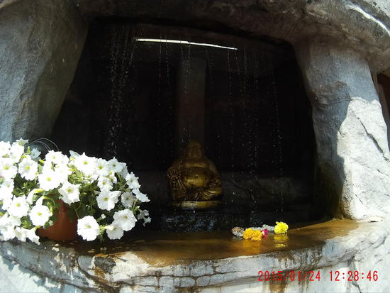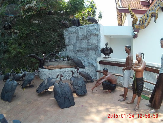 Nach vielen Fotos und einer filmisch festgehaltenen Runde um die Glocke, geht es wieder bergab. Schuhe aufsammeln und an der anderen Seite runter. Weiter Glöckchen bimmeln. Der Weg ist nicht derselben wie hinauf, es gibt deutlich mehr Abzweigungen. Ich bummle mal hier, mal dort und verliere fast die Orientierung. Ein weiterer Tempel, ein kitschig geschmückter Teich, ein sehr interessant gewachsener Baum und plötzlich Geier. Ja, Geier, jede Menge Plastikgeier. Darunter, liegend platziert, zwei künstliche Leichen. Eine davon ein Skelett, die andre mit heraushängenden Gedärmen modelliert. Diese Seite des Berges ist wohl dem Tod vorbehalten? Als ich die Anlage verlasse, stelle ich fest, dass am Fuß des Berges jede Menge Nischen zum Gedenken an die Verstorben angelegt wurden.