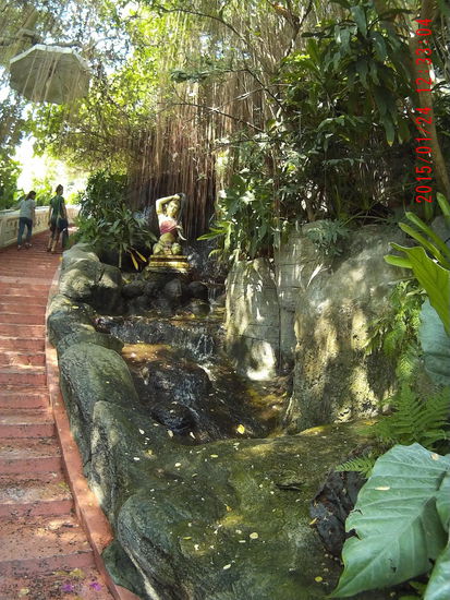Am Fuß des Berges, wo die Treppe beginnt, sehe ich schon das Ende eines Bachs, der kaskadenartig den Berg herunterkommt. Das Wasser scheint so kalt, dass es Sprühnebel in der Luft bildet, das kann doch nicht normal sein?