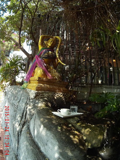 Im Schrein gibt es eine Menge Statuen, denen ganz unterschiedliche Dinge geopfert werden. Geschenke, Blattgold, Räucherstäbchen, vor einer Statue steht eine Vase in die langstielige Blumen gestellt werden. All das und noch mehr kann man wie in jedem Tempel direkt vor Ort kaufen. Gegenüber des Eingangs sitzt auch der Mönch, der die Litanei liest. Das wird also live nach draußen übertragen...