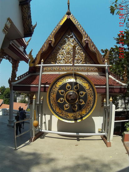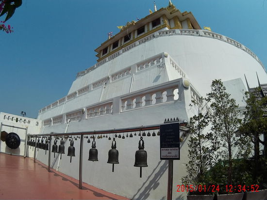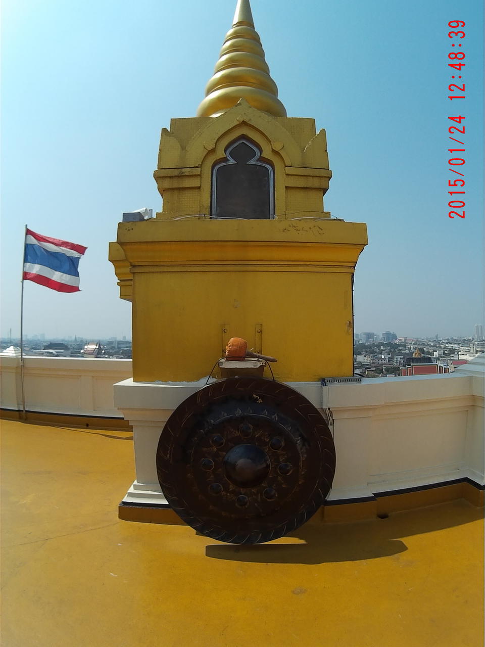 Nun geht es eine letzte Treppe hoch aufs Dach. Hier ist nicht mehr nur die Aussicht spektakulär. Eine meterhohe goldene Glocke türmt sich über dem inneren Schrein, geschmückt mit tollen Statuen an den vier Ecken. Ich bin hin und weg von dem Bild, wie diese riesige goldene Glocke über Bangkok trohnt und weiß nun auch, woher der Name "Golden Mountain " wohl kommt.