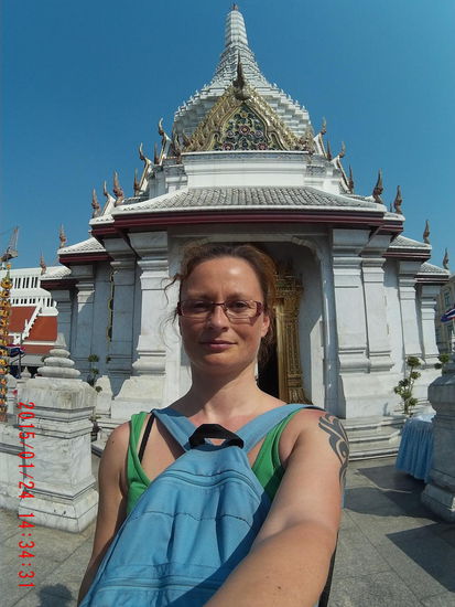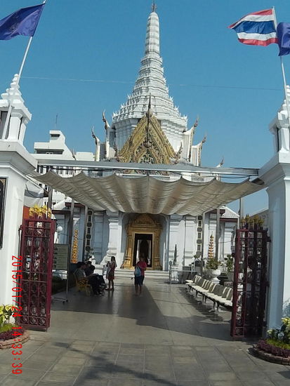 An einem Stand habe ich noch schnell Mango in der Tüte gekauft (wie ich diese Obststände liebe) und esse diese, während versuche, den Park zu finden. Er liegt hinter einer ziemlich verschlungenen Kreuzung. Aber schließlich hab ich es geschafft, sie zu überqueren. Nur leider hat der Park so gar keine Bäume und dampft in der prallen Sonne. Er besteht einfach nur aus einer großen Rasenfläche. Ein Mann übt darauf mit seinem Gleitschirm. Dann fällt das Bummeln im Schatten, auf das ich mich schon gefreut habe, also aus. Nach dem Park müsste ich als erstes auf den Wat Phra Kaew treffen, den ich mir sicher auch anschauen will. Dann noch den Palast und Wat Pho und um 6.00 pm am Hotel sein, um die Gruppe zu treffen. Sieht fast so aus, als müsste ich Wat Arun morgen machen. Aber erstmal zieht ein Gebäude auf der linken Seite meine Aufmerksamkeit auf sich, nicht nur wegen der Architektur, sondern auch weil dort so ein Betrieb ist. Das muss ich mir näher anschauen, auf ein Gebäude mehr kommt es nun auch nicht an...und so kommt es, dass ich mir meinen ersten Schrein anschaue, The City Pillar Shrine.