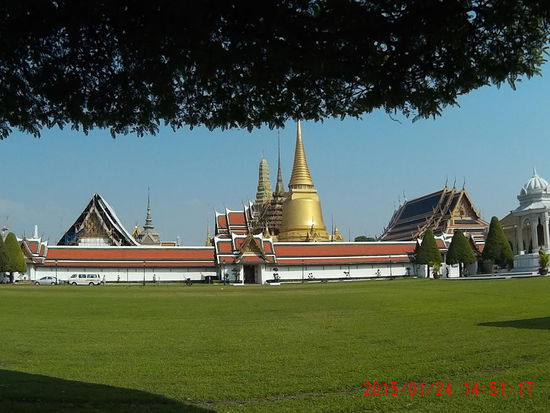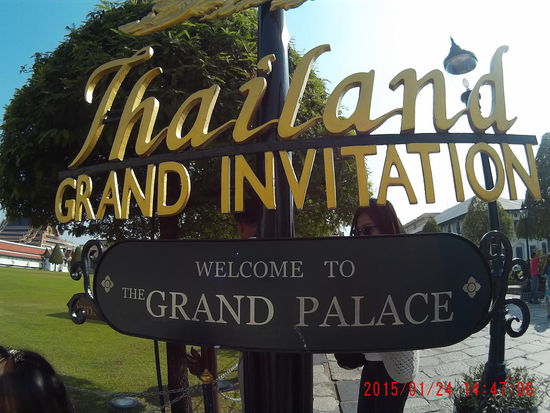 Der Grand Palace ist wirklich "grand" und für Touristen gibt es nur einen Eingang. Dort ist also diesmal wirklich ein riesiges Gedränge. Als erstes kommt ein Kontrollpunkt. Mir wird wie allen gesagt, ich muss Beine und Arme bedecken. Also die Hosenbeine an die Hose basteln und Hemd überziehen. Dann mache ich ein Foto von dem Palast aus der Entfernung, nicht ganz so einfach bei den Menschenmassen. Ich gehe weiter und stelle drei Dinge fest: