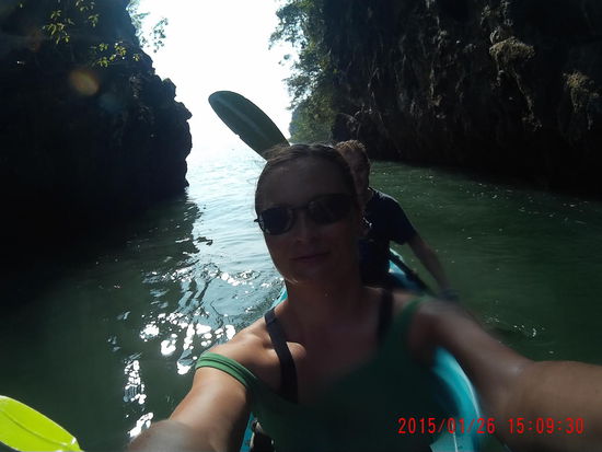 Zusammen mit den anderen dümpeln wir rum, bis alle soweit sind. Sooo viele sinds dann doch nicht. Wir paddeln aus der Bucht heraus und über das Meer, steuern eine der schönen Felsformationen an. An dieser paddeln wir entlang, bis sich eine Schlucht auftut, in die wir hineinfahren.