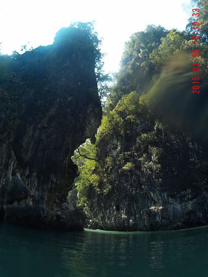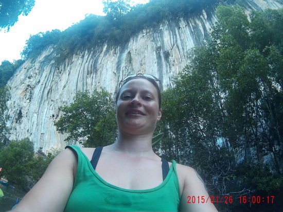 Die Schlucht erweitert sich zu einem kleinen See, von Felswänden und darauf Dschungel umgeben, die Zikaden sind unwahrscheinlich laut und das Wasser ist türkis, aber trüb. Wir warten auf die anderen und fotografieren fleißig die Umgebung und uns gegenseitig. Ich lasse die Füße ins Wässer hängen. Vorsicht, die Krokodile lacht der Guide. 5 Meter lang? frage ich. Ja, mindestens...