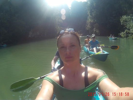 Als er versucht, meine Beine auseinander zu drücken, erschrecke ich mich und schubse ihn reflexartig weg. Da hockt er nun im Bug und das gefällt ihm gar nicht. Er fauchte mich mit seinem eindrucksvollen Gebiss an. Dont touch, brüllt der Guide. Von wegen. Ich hebe das Paddel, fixieren den Affen und schreie "Go away or I will hit you " (in der Hoffnung, dass der thailändische Affe ich der Schule aufgepasst hat und Englisch kann?)