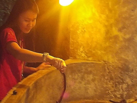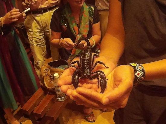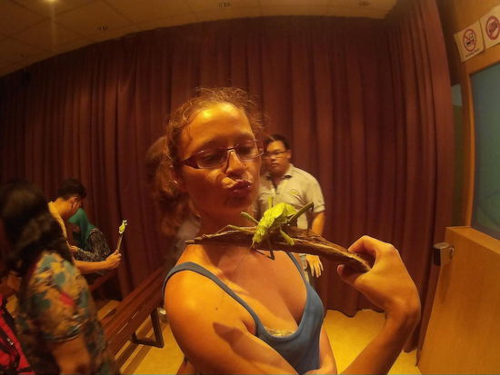 Später habe ich Glück und treffe bei den Tausendfüßlern dieselben Asiaten wieder. Wie das mit Asiaten (ich tippe auf Chinesen in dem Fall) so ist, umringen sie mich plötzlich und haben auch keinerlei Berührungsängste. Eine ältere Dame legt mir vertraulich die Hand auf die Schulter. Sie haben eine junge Frau dabei, die wohl Biologin ist. Sie nimmt mal eben einen kleinen und dann auch einen der großen Tausendfüssler aus deren Habitat und erklärt auch mir einiges auf Englisch, dabei gechillt mit dem Tausendfüßler in einer Hand gestikulierend.
