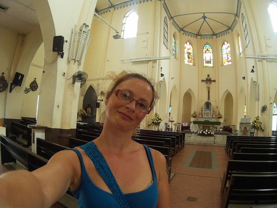 Da die Wege alle so kurz sind, beschließe ich, nun doch auch zur St. Francis Xavier Church zu laufen und zu schauen, ob sie wirklich schief ist oder nicht. Ich laufe am Fluß entlang und genieße die Aussicht auf die Fassaden der schmalen Häuser auf der anderen Seite und den Schatten der Häuser auf meiner Seite. Im Untergeschoss fast jeden Hauses ist ein kleines Restaurant oder Café. Manche der Obergeschosse sehen so aus, als könnten sie ein Gästezimmer beherbergen. Bestimmt schön hier zu wohnen... Ich biege am Ende der Häuserzeile um die Ecke und muss lachen. Die St. Francis Xavier Church ist tatsächlich ziemlich shepp, zumindest von hier aus betrachtet. Ich mache ein paar Fotos, versuche die Neigung einzufangen. Ich bin hier der einzige Tourist. An der Seite der Kirche schläft ein Obdachloser. Innen ist es schön kühl und die Fensterbilder gefallen mir.