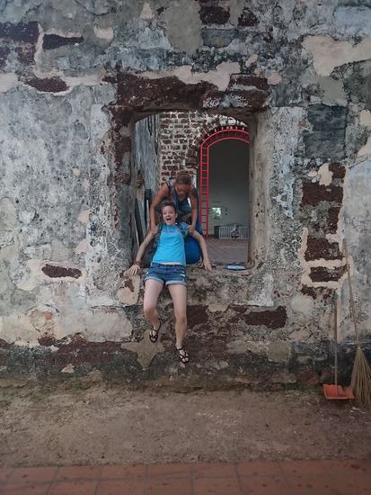Lunch essen wir noch alle zusammen. Pong führt uns (ziemlich im Zickzack) durch das Einkaufszentrum nebenan. Zeigt uns den Ausgang zum St. Paul's Church Hill wo wir uns später zum Sonnenuntergang treffen wollen. Direkt darunter liegt das alte Torhaus der spanischen A Famosa Festung, super denn dort will ich meine Tour starten. Zurück in die Mall, auf der anderen Seite wieder raus, über die Straße, in eine andere Mall und dort essen wir Lunch. Ich esse Ente, wie viele, bin aber etwas enttäuscht über das zähe Tier.