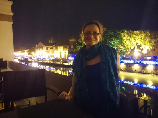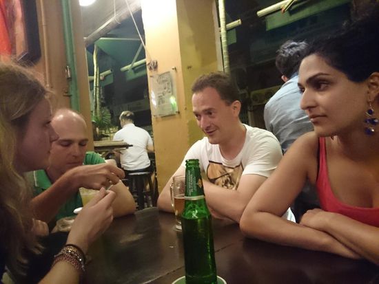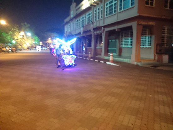 Nach dem Essen hat Pong 2 Empfehlungen für Bars, irgendwie wird die Entscheidung für eine Bar in der Straße beim Hotel getroffen. Dena und Sophie möchten gerne mal mit einer der bunt erleuchteten und laute Musik spielenden Fahrradrikschas fahren, der Rest läuft. Als wir am Hotel vorbei kommen, sind irgendwie alle müde und gegen ins Bett, nur die Deutschen bleiben mal wieder übrig. Als wir an der Bar ankommen, gibt es lange Gesichter. Die Bar liegt ziemlich ungeschützt direkt an der Straße, sieht teuer aus und ist komplett leer. Also wenn wir schon in Melaka etwas trinken, warum dann nicht in der Jonker Street, wo, wenn überhaupt Leute unterwegs sind, das Flair vielleicht eher wie in der Khao San Road ist.