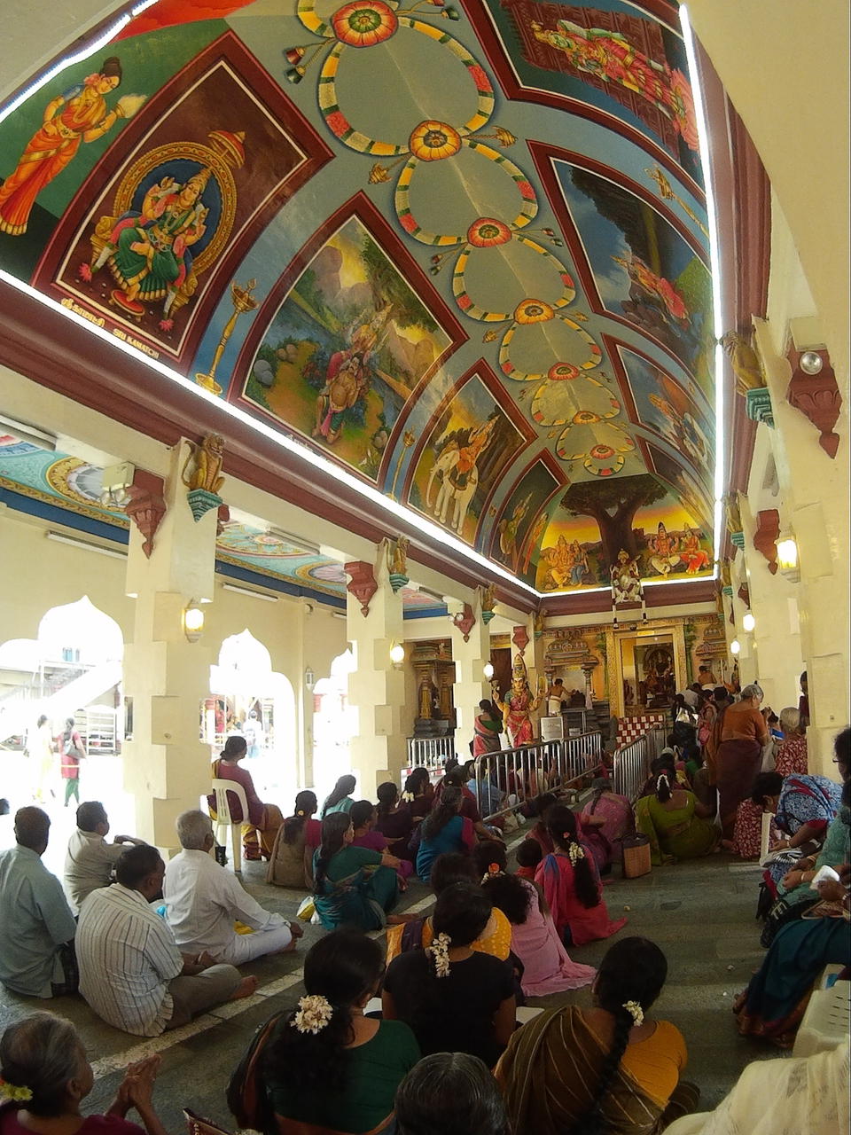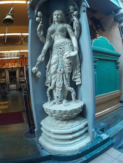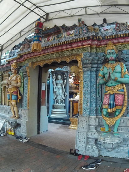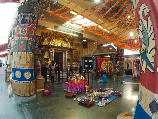 Nach einem späteren Frühstück als geplant (der böse Wecker wieder), checke ich aus und stelle meine Rucksäcke beim extrem hilfsbereiten Portier ab. Dann stelle ich fest, dass es regnet und zwar sehr! Was jetzt? Ich ziehe dennoch zu Fuß Richtung Little India los, so schlimm wirds schon nicht sein. Ich versuche, unter den Hausdächern zu bleiben, aber als ich Little India und meinen ersten Tempel für heute erreiche, bin ich klatschnass. Der Shree Lakshminarayan ist auch nicht so spektakulär und ich habe das Gefühl, die auf dem Boden sitzenden Gläubigen zu stören.