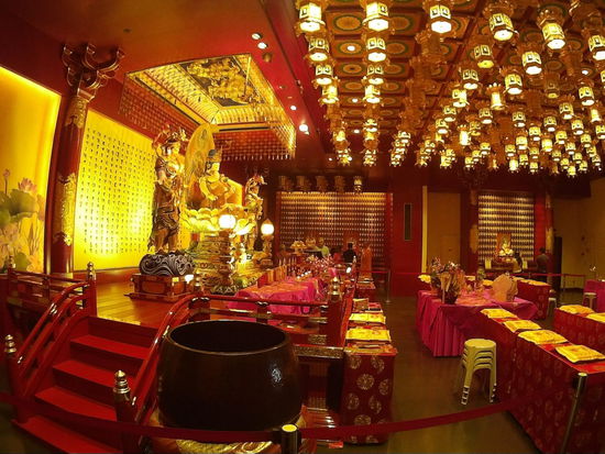 Der chinesische Buddha Tooth Relic Temple ist unglaublich beeindruckend. Wer nur Zeit oder Lust für einen einzigen Tempel in Singapur hat, sollte sich diesen anschauen. Fotografieren ist leider nicht in allen Bereichen erlaubt. Nachdem ich das Erdgeschoss besichtigt habe und dabei das Glück habe, ein Ehepaar, das mit einem Mönch eine Gebetszeremonie durchführt, zu sehen, fahre ich mit einem Fahrstuhl (der erste, den ich in einem Tempel gesehen habe) ins vierte Geschoss.
