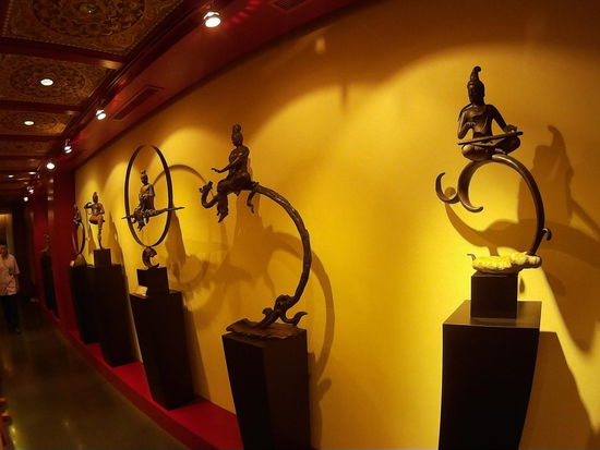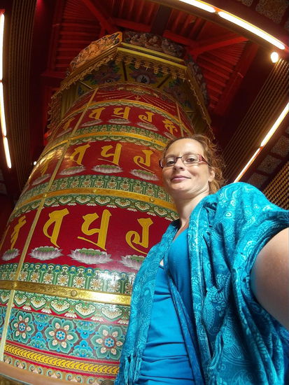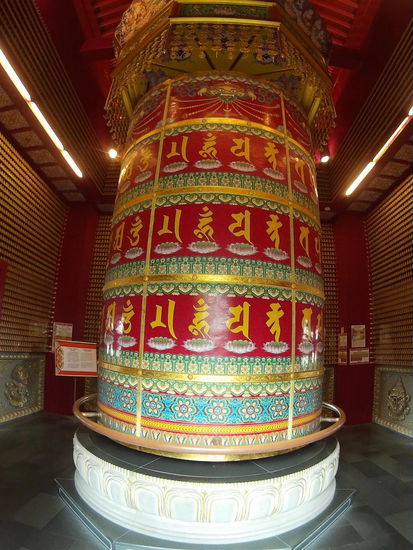 Eine Treppe führt vor den Fahrstühlen hoch aufs Dach, dem ich natürlich einen Besuch abstatte. Wunderschön bepflanzt ist es ein ganz anderer Ort der Stille, als der strenge Reliquienraum darunter. Im Mittelpunkt des Daches beherbergt ein kleines Gebäude mit Pagodendach eine große buntbemalte Rolle (gibt bestimmt einen speziellen Namen dafür), die sich drehen lässt und vermutlich genau über dem Schrein mit dem Relikt steht. An den Wänden wird erklärt, dass jede Umdrehung einen Satz aus der heiligen Schrift symbolisiert. Die Rolle drehen, ist also wie beten. Ich drehe dennoch und hoffe, dass das nicht unhöflich ist.