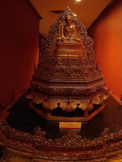 Dort kann man den Raum vor dem Raum, in dem die Reliquie, von der der Tempel seinen Namen hat, aufbewahrt wird, besichtigen. Ein großes Fenster ermöglicht einen Blick in den Nebenraum auf den Schrein. Es herrscht eine sakrale Atmosphäre, fotografieren oder Lärm jeder Art ist nicht gestattet. An den Wänden sitzen Gläubige auf gepolsterten Podeste und meditieren. Vor dem Fenster sitzt ein Mönch an einem Schreibtisch. Witzigerweise entspricht sein Gesichtsausdruck und sein Benehmen trotz der safranfarbenen Küste ziemlich gut dem eines deutschen Beamten oder Rezeptionisten. Ich versuche so wenig wie möglich zu klingeln, das erste Mal, dass ich die Kettchen als störend empfinde, und durchquere den Raum. Der Nebenraum ist ebenso prächtig geschmückt, aber die Reliquie sieht man nicht. Sie ist wohl verwahrt in einem Schrein, vor dem Opfergaben stehen.