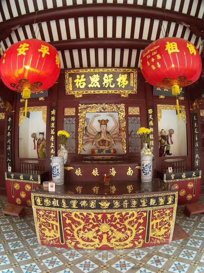 Dann mache ich mich auf den Weg zum Thian Hock Keng Tempel. Er liegt nur durch einen kleinen Park getrennt genau neben einer Moschee. Es scheint, dass die Religionen in Singapur friedlich nebeneinander koexistieren. An diesem ebenfalls chinesischen Tempel faszinieren mich mal wieder vor allem die gemalten Torwächter.