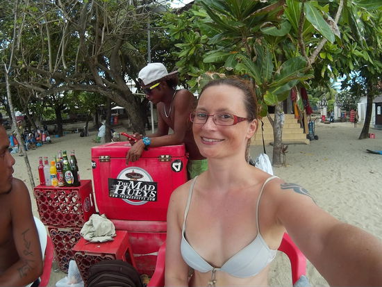 Ich werde zwar mehrfach eingeladen, mich dazu zusetzen, lehne aber immer ab. Denn etwas trinken will ich nicht. Aber einen anderen Platz im Schatten zum Liegen gibt es nicht. Selbst wenn, würde ich meine Sachen hier nicht allein lassen, bei den ganzen fliegenden Händlern und Beachboys (ihr wisst ja mittlerweile wie misstrauisch ich bin, oft grundlos).