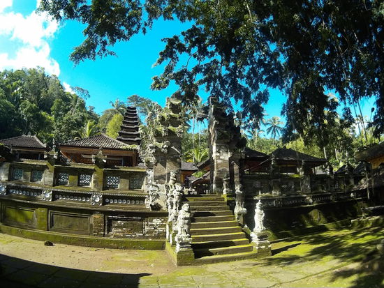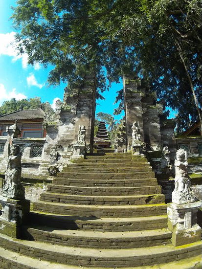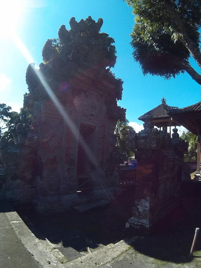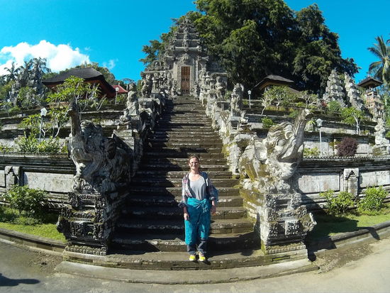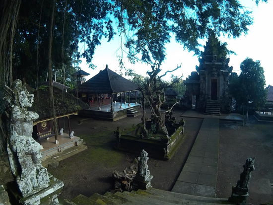 Der andere Tempel Pura Dalem Cungkub muss dann auch in der Nähe sein. Ja, ich finde ihn in einer weiteren Seitenstraße, nicht ganz da, wo die Karte ihn vermuten lässt. Hier bin ich ganz allein. Ich steige mit Sarong um die Hüfte die Treppe hoch und schiebe ich das Tor auf. Ein wenig verstohlen betrete ich das Tempelgelände.