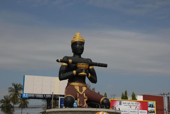 Um 8:00 Uhr gehen wir frühstücken. Michael isst Omelette mit Toast und ich Baguette mit Butter und Erdbeermarmelade. Dazu gibt es wie gestern eine große Kanne grünen Tee und einen Teller mit Papaya und Ananas. Danach fragt Michael noch mal nach unseren Bustickets. Heute Abend sollen sie da sein, ich bin mal gespannt. In Siem Reap im Hotel war das alles kein Problem. Unser Tuk-Tuk-Fahrer Chai wartet schon auf uns und es kann gleich los gehen. Zuerst besuchen wir das nahe gelegene Kloster Wat Kardal, welches sehr alt ist. Weiter geht's in die Stadt. Michael muss zuerst noch Geld umwechseln. In der Bank muss er eine Nummer ziehen und warten bis er aufgerufen wird. Es gibt extra einen Schalter für Touristen. Er bekommt problemlos seine Dollar in Rhiel umgetauscht und somit können wir noch schnell ein paar Mandarinen auf dem Bauernmarkt einkaufen und dann unsere Fahrt fortsetzen. Wir fahren durch einen Kreisverkehr in deren Kreismitte eine Statue von Ta Dambong (Begründer von Battambang) steht. Dieser hält einen Zauberstab in der Hand den dan Bat Dambong, der der Stadt den Namen gab. Dieser Zauberstab soll einem Khmer König seine Kräfte verliehen haben.