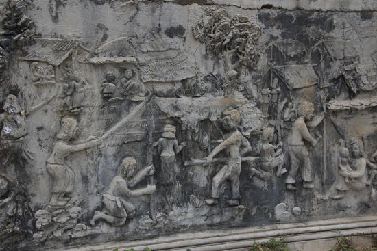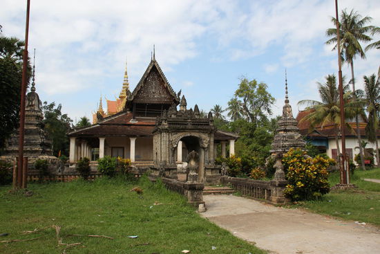 Wir fahren durch eine schöne Landschaft und an vielen Reisfeldern vorbei zu dem Kloster Wat Samrong Krong. Dies ist ein modernes Kloster mit einer Ruine aus der Angkorzeit. Bis 1970 Galt dieser Tempel als einen der schönsten aus dieser Angkorperiode und wurde von vielen Touristen besucht. Später wurde er von den Roten Khmer als Gefängnis benutzt. Ein Stück weiter gibt es eine Gedenkstätte wo in Reliefs dargestellt wird, wie die Leute von Battambang von den Roten Khmer aus ihrer Stadt vertrieben und umgebracht wurden. Eine Säule mit innenliegenden Gebeinen erinnert daran.