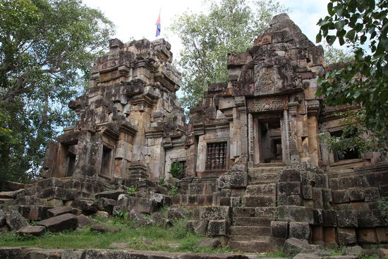 Danach geht es weiter nach Wat Ek. Hier stehen wieder fünf Tempel aus der Angkorzeit, die aber schon sehr verfallen sind. Zuerst müssen wir über 300 Stufen hinaufsteigen um diese aus Sandstein und Lateritstein gebauten Tempel zu sehen.