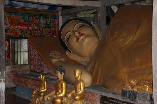 Danach geht es weiter zu dem Berg Phnom Sampeau, er liegt 18 km von Battambang entfernt. Man kann über eine sehr steile Treppe auf den Berg gelangen, den Fahrweg hoch gehen oder sich von einem Mopedfahrer hochfahren lassen. Wir entscheiden uns für die mittlere Variante und laufen gemächlich den Berg hinauf. Zuerst kommen wir an die Killing-Caves (Teng-Klun-Höhle), dies sind Höhlen, wo die Roten Khmer Menschen durch die Decken oder über die Klippen hinunter warfen. Heute werden noch Gebeine von Opfern unter einem liegenden Buddha zum Gedenken aufbewahrt.