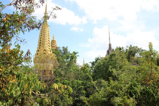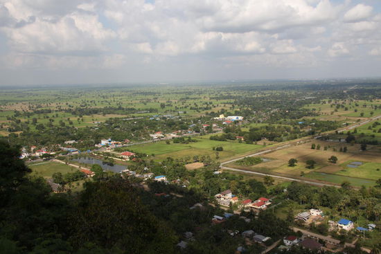 Wir gehen weiter den Berg hinauf und zu den auf dem Gipfel stehenden Pagoden. Von hier hat man einen sehr schönen Blick über das Tal und über die Gegend, die die Reisschüssel Kambodschas genannt wird.