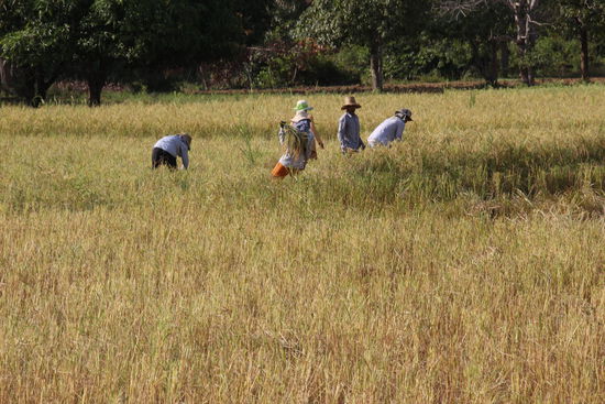 Wir sehen Bauern, die ihre Reisfelder abernten. Chai erzählt uns, dass ca. 8 Personen 1 Hektar Reis pro Tag abernten können und dafür ca. 5-6 Dollar( ca. 5 Euro) pro Tag bei 7-8 Std. Arbeit verdienen. An diesem Mittag hatten wir schon Bauern getroffen, die uns eine kleine Tüte Reis aus eigener Produktion geschenkt haben. Sie erzählten uns, dass sie dieses Jahr von 10 Hektar ca. 23 Säcke Reis a 100 Kg geerntet haben.