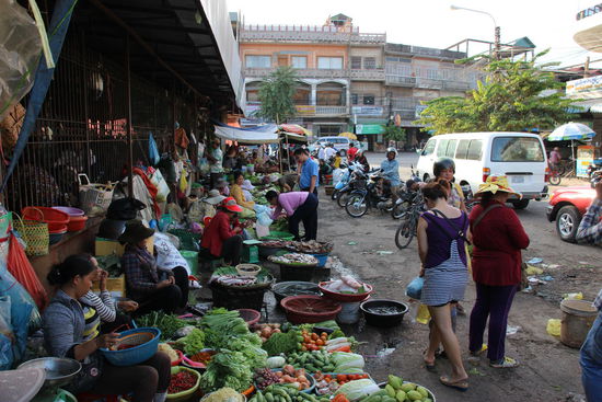 Wieder im Hotel angekommen, gehen wir noch schnell in die Stadt auf den Markt Phsar Nath. Hier bekommt man Obst, Gemüse, Fleisch, Kleidung, Schmuck, Lederwaren, man kann sich die Haare frisieren, die Füße oder die Hände maniküren und die Nägel lackieren lassen und vieles mehr.
