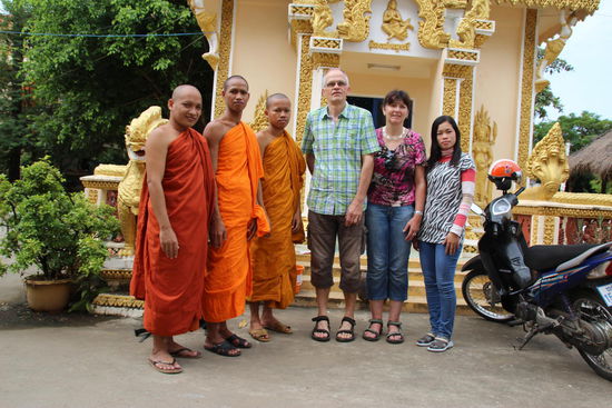 Leider können wir es nicht von innen besichtigen, weil es ein bewohntes Kloster ist. Wir schauen uns auf dem Außengelände um und treffen dabei in einem kleinen Nebenhäuschen auf drei in orangefarbene Tücher gekleidete Mönche. Sie bitten uns herein und wir müssen erst einmal über uns und unsere Heimat erzählen. Sie sind auch sehr Fußball interessiert und kennen natürlich den FC Bayern München. Die Mönche sind sehr wissbegierig und wir beantworten gerne ihre Fragen. Danach machen wir noch ein Erinnerungsfoto und E-Mail Adressen werden ausgetauscht.