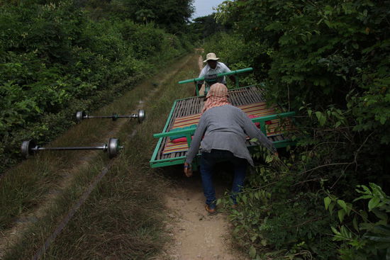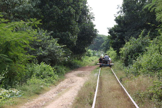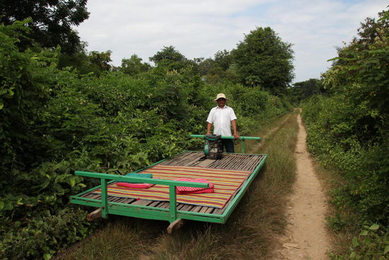 Hinterher fahren wir mit dem Tuk-Tuk weiter zum Phsar Leu, einem Bauernmarkt. Wo man wieder jede Menge Erzeugnisse der Bauern kaufen kann. Dieser Markt ist besonders für seine guten Mandarinen und Orangen bekannt. Wir kaufen uns ein paar Bananen, Mandarinen, eine Mango und eine halbe Ananas (beides schon geschält und fertig zum Essen)ein. Die Mandarinen haben einen tollen Geruch und sind richtig frisch und nicht gewachst. Sie schmecken richtig fruchtig und haben nur ein bisschen viele Kerne drin. Wir bezahlen für alles zusammen weniger als 2 Euro. Danach geht es weiter zum Bambootrain. Der Bambootrain ist einzigartig auf der Welt, er besteht aus einer Bambustransportplattform mit 2 Achsen und Sitzkissen für 4-5 Pers. Er wird angetrieben von einem kleinen Motorrad-Motor, der auf den alten Schienen der ehemaligen von Frankreich erbauten Strecke von Phnom Penh nach Battambang fährt.