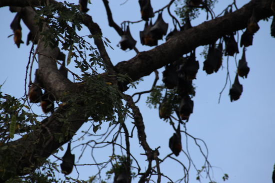 Ziemlich durchgerüttelt und durchgeschüttelt fahren wir weiter. Wir kommen an den Fruitbads vorbei, das sind Fledermäuse die bei Tag an einem Baum hängen und dessen Früchte fressen. Diese Tiere sind wesentlich größer als die kleinen Fledermäuse bei uns und machen auch doppelt soviel Krach.